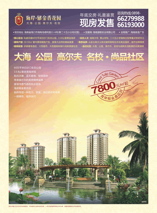 海南就是廣告有限公司為海岸郁金香花園項目獨家整合推廣代理商,負(fù)責(zé)項目整合推廣,合約推廣期為2年,從前期市場策劃到項目定位、VIS形象設(shè)計、全程營銷策劃、執(zhí)行,就是廣告一直以高度熱情的工作態(tài)度,認(rèn)真、負(fù)責(zé)地專業(yè)精神克服了重重困難,以一天銷售114套的驚天銷量,橫掃整個海南房地產(chǎn)市場。